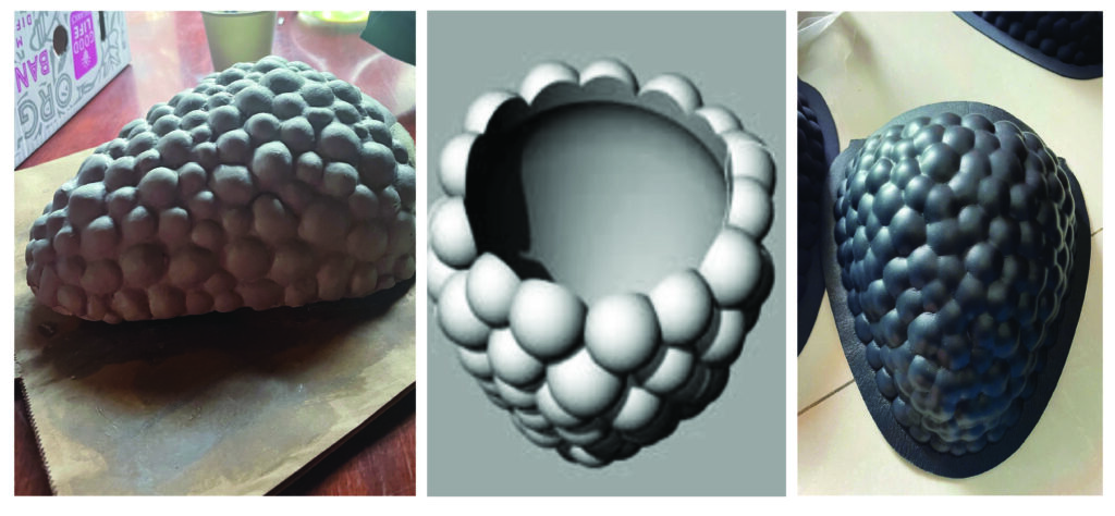 A positive clay form was shaped, then transformed into a negative mould. The clustered surface; inspired by the drupelets of a blackberry, required careful calibration.