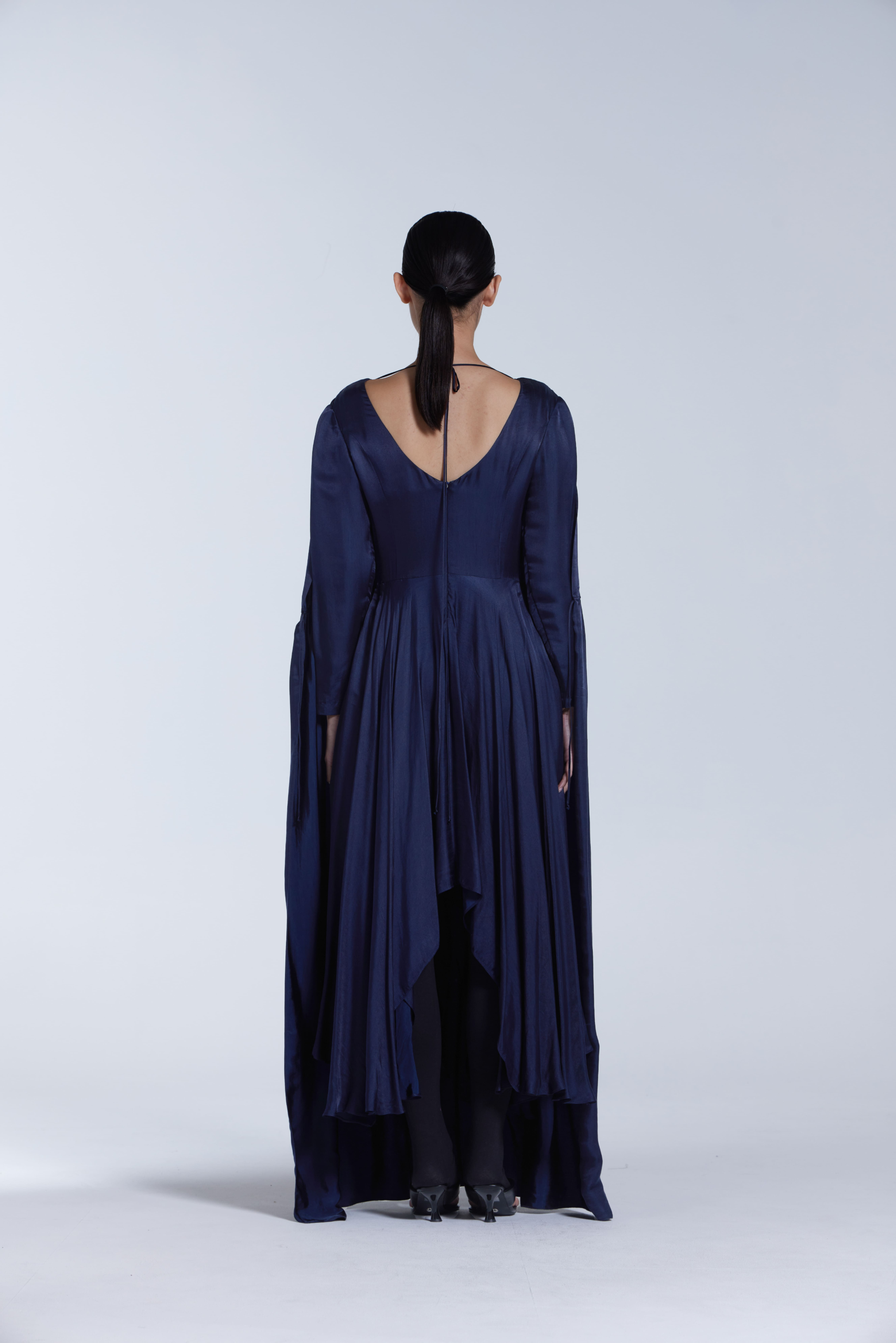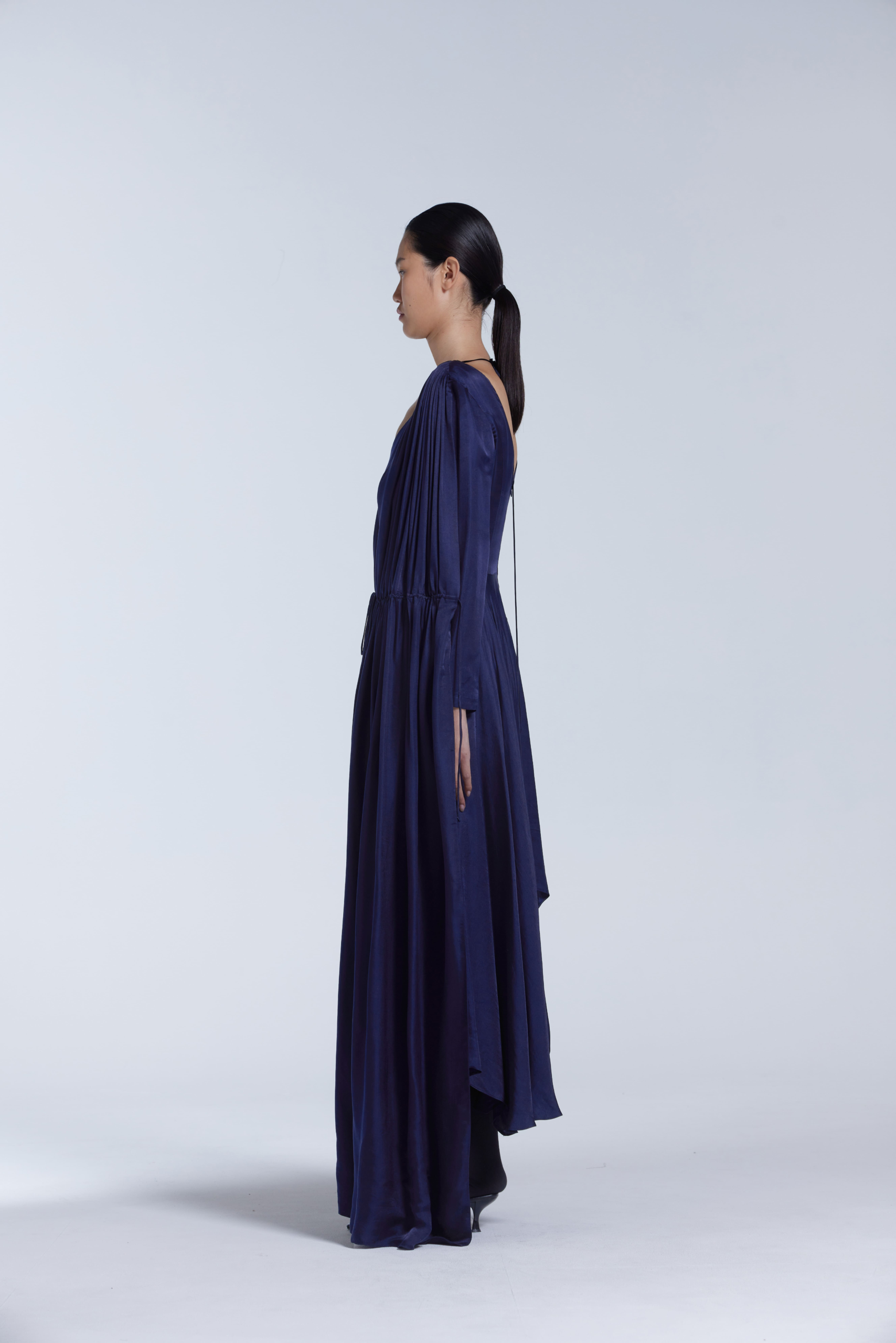 Draped in luminous blue, the Loose Panel Floor-Length Dress exudes effortless sophistication. Crafted from a silk-blend fabric with two-tone silk, it falls to the floor with graceful fluidity and is lined for comfort. A deep V-neckline and gently gathered waist introduce subtle sensuality, while two adjustable gathering panels allow you to customise the shape from loose and flowing to more cinched and dramatic. Slightly oversized with a floor-length drape, it is designed for special occasions yet feels quietly relaxed.