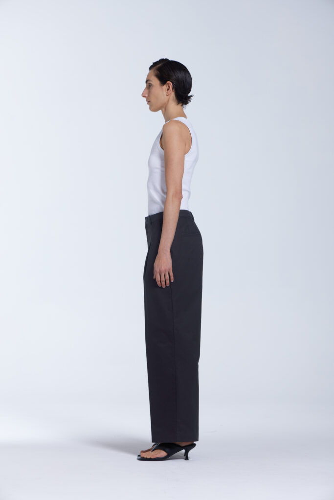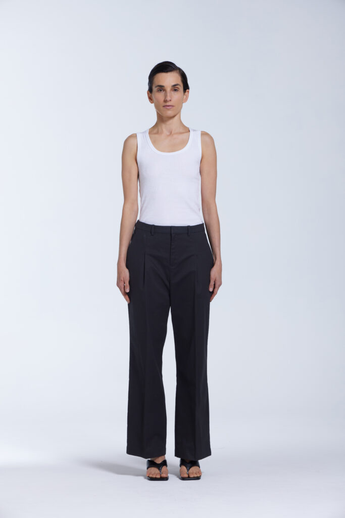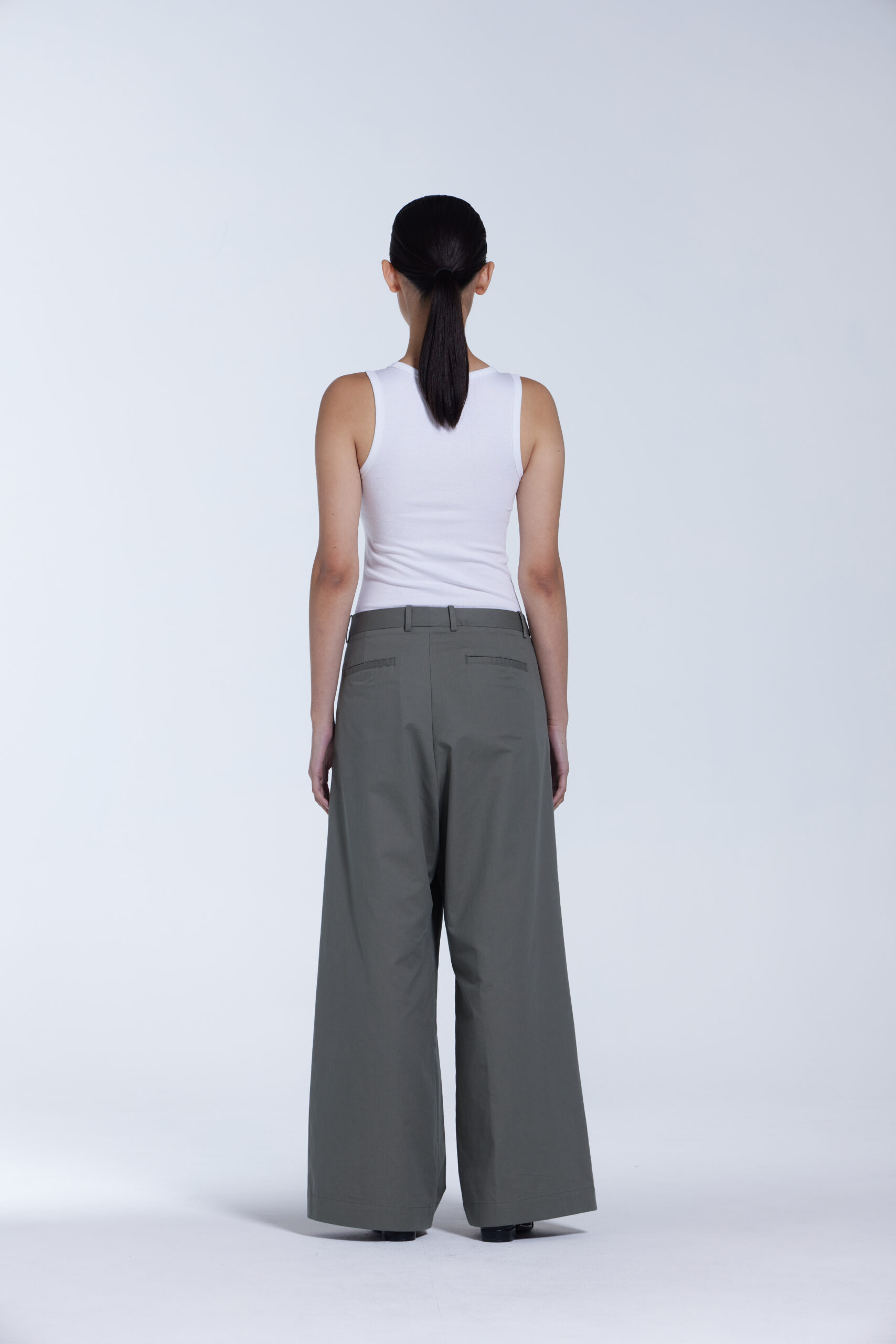 Crafted from durable cotton-blend twill, these wide-leg khaki pants offer a refined yet effortless silhouette. Designed with subtle front pleats and a mid-rise tailored fit, they balance structure with ease, making them a versatile foundation for workwear or weekend styling. Pair with a crisp shirt for polished sophistication or keep it minimal with a simple tank for understated elegance.