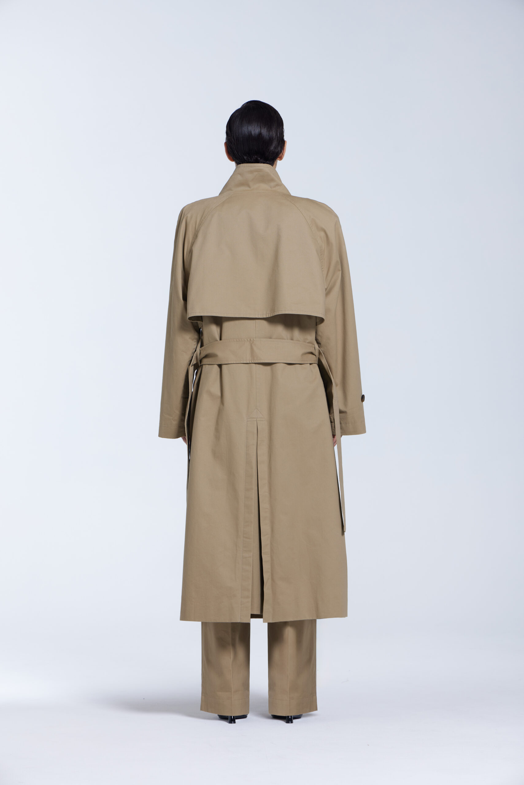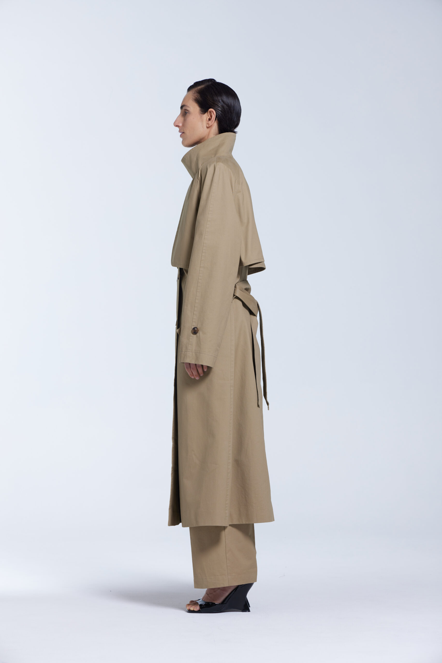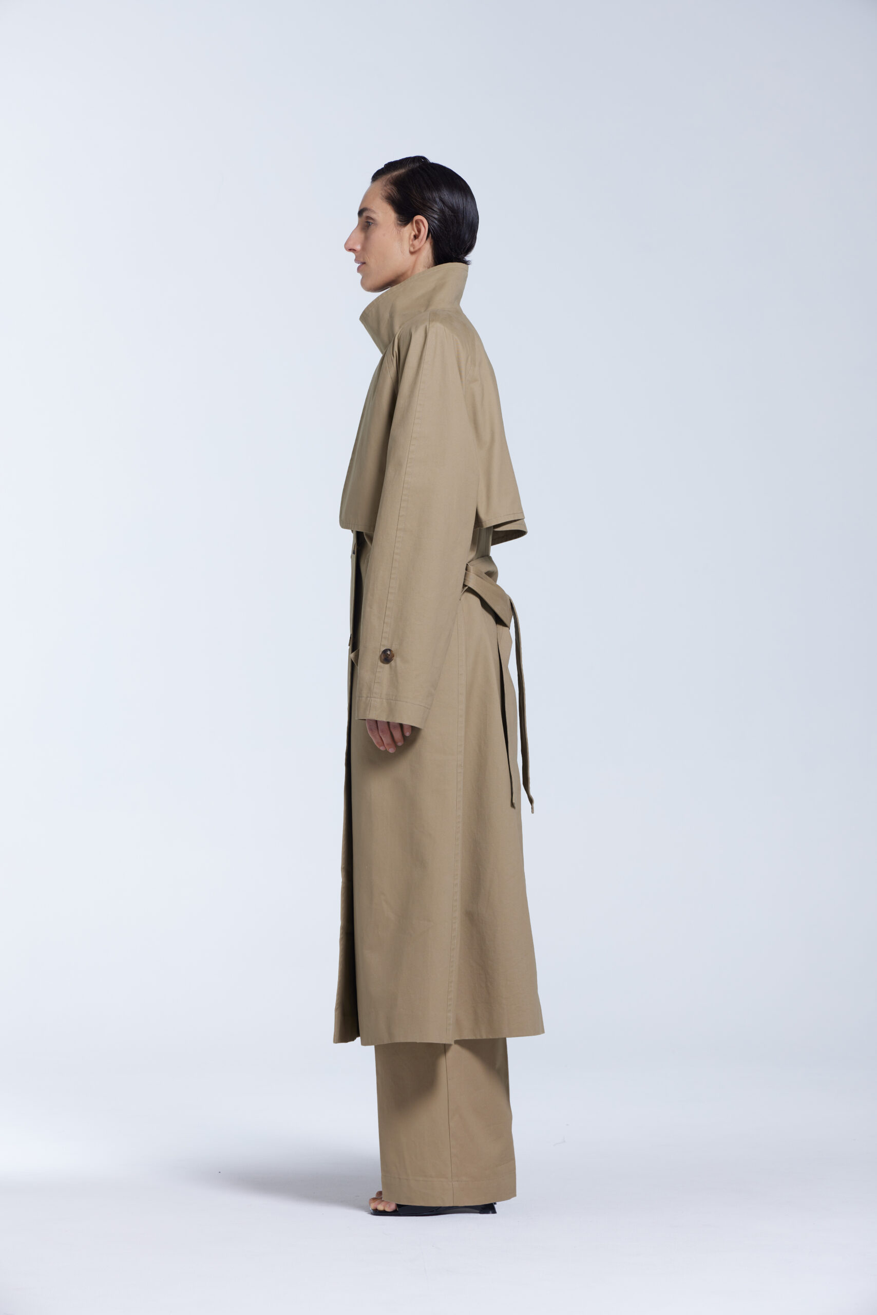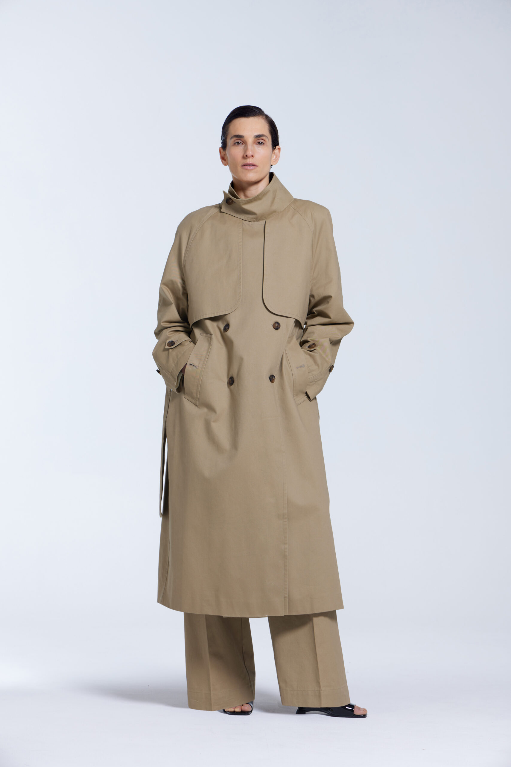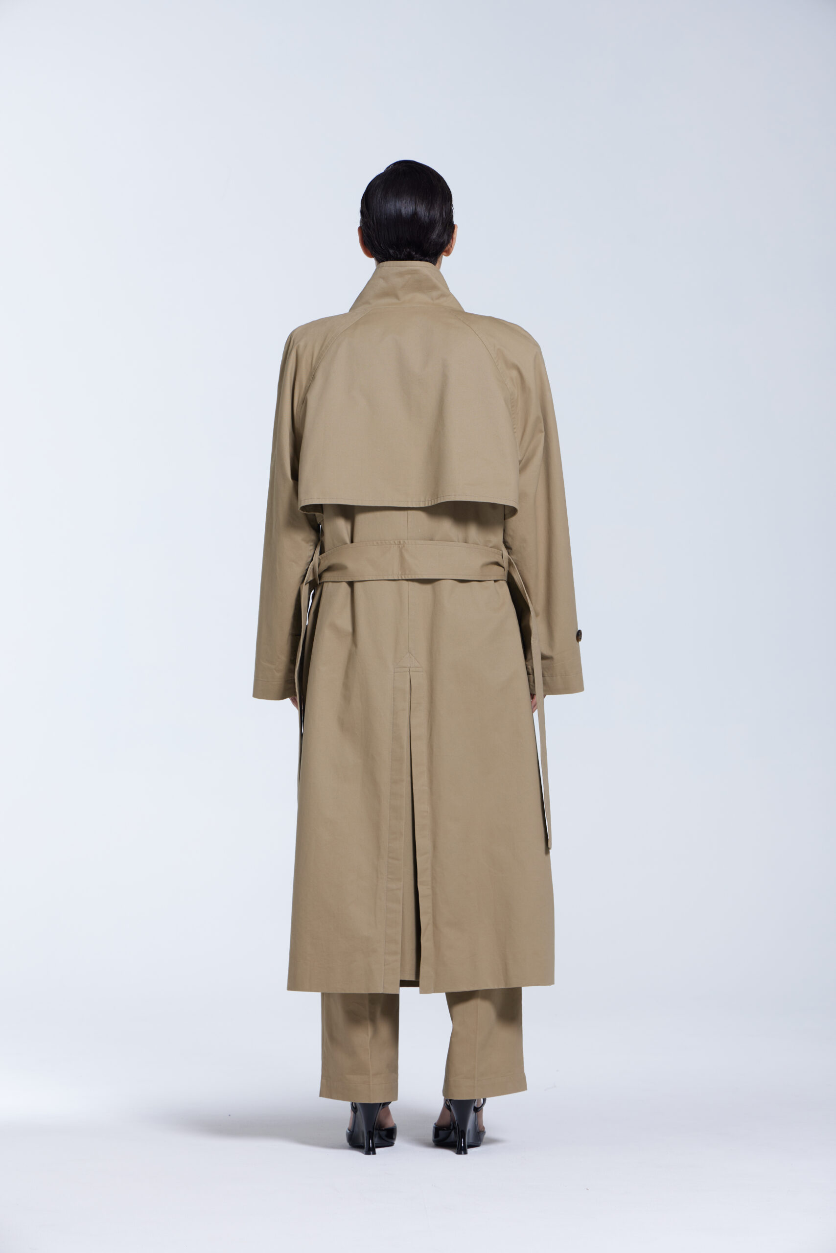 The Stand Collar Trench Coat offers a refined, contemporary take on the classic trench. Crafted from premium cotton, it features a slightly oversized silhouette, double-breasted front, wide lapels, a stand collar, adjustable cuff straps, and deep side pockets. The elongated cut creates a sleek, modern line ideal for layering over tailoring or denim.